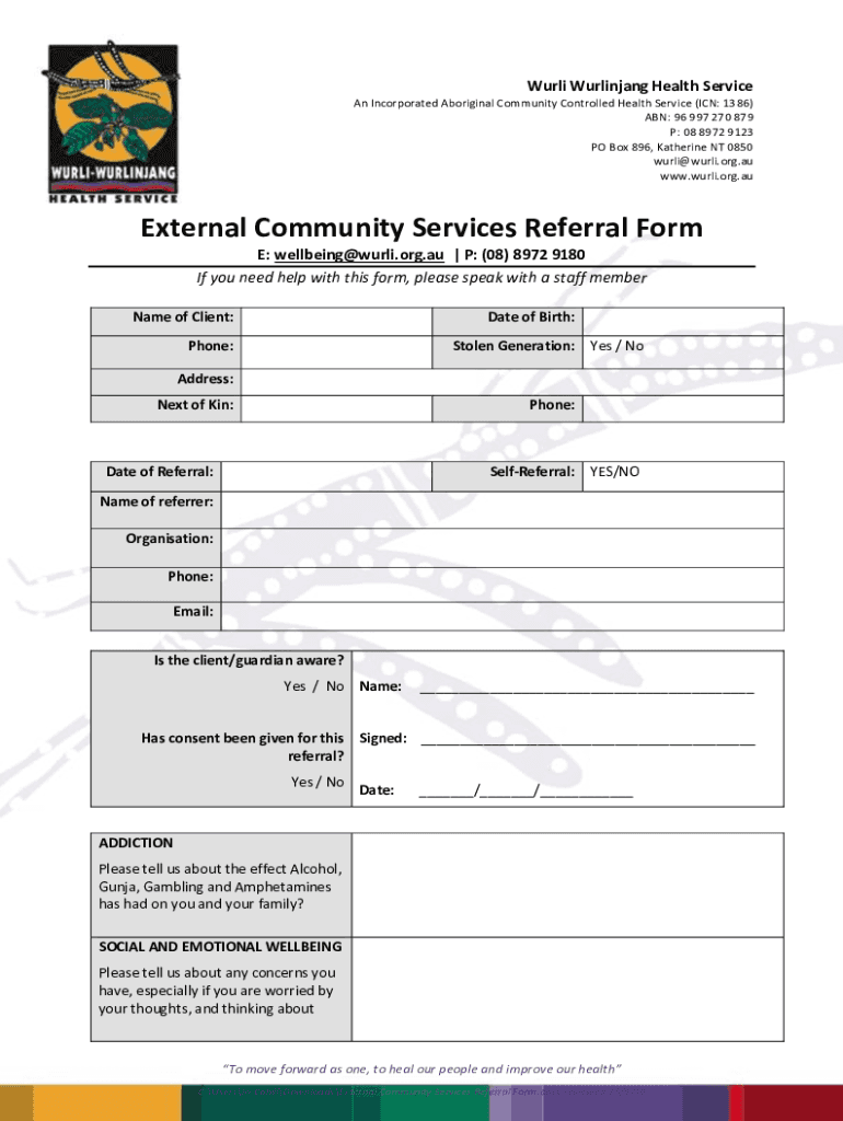 World Wurlinjang Health Service An Incorporated Aboriginal Community Controlled Health Service (ICN: 1386) ABN: 96 997 270 879 P: 08 8972 9123 PO Box 896, Katherine NT 0850 world.org.AU www.wurli.org.auExternal