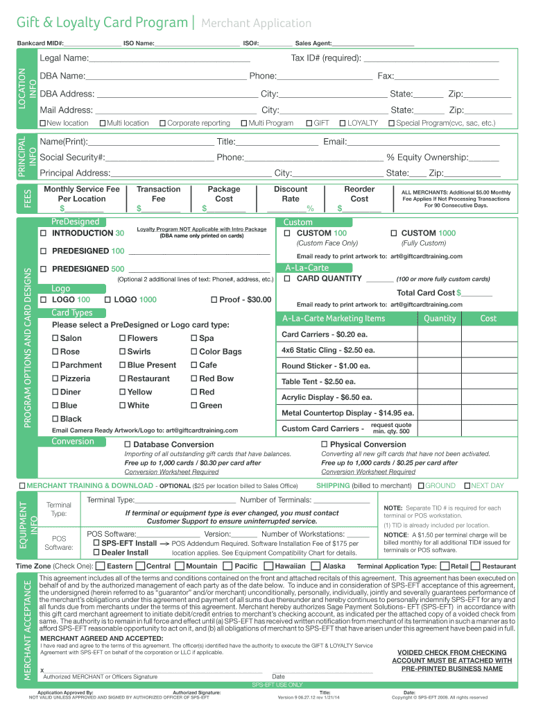 The Gift & Loyalty Card Program Merchant Application is a business form used by merchants to apply for a gift and loyalty card program through SPS-EFT.