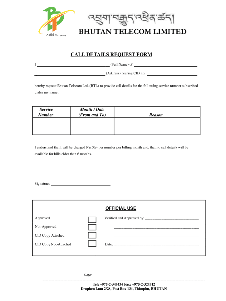 (Address) bearing CID no. Hereby request Bhutan Telecom Ltd. (BTL) to provide call details for the following service number subscribed