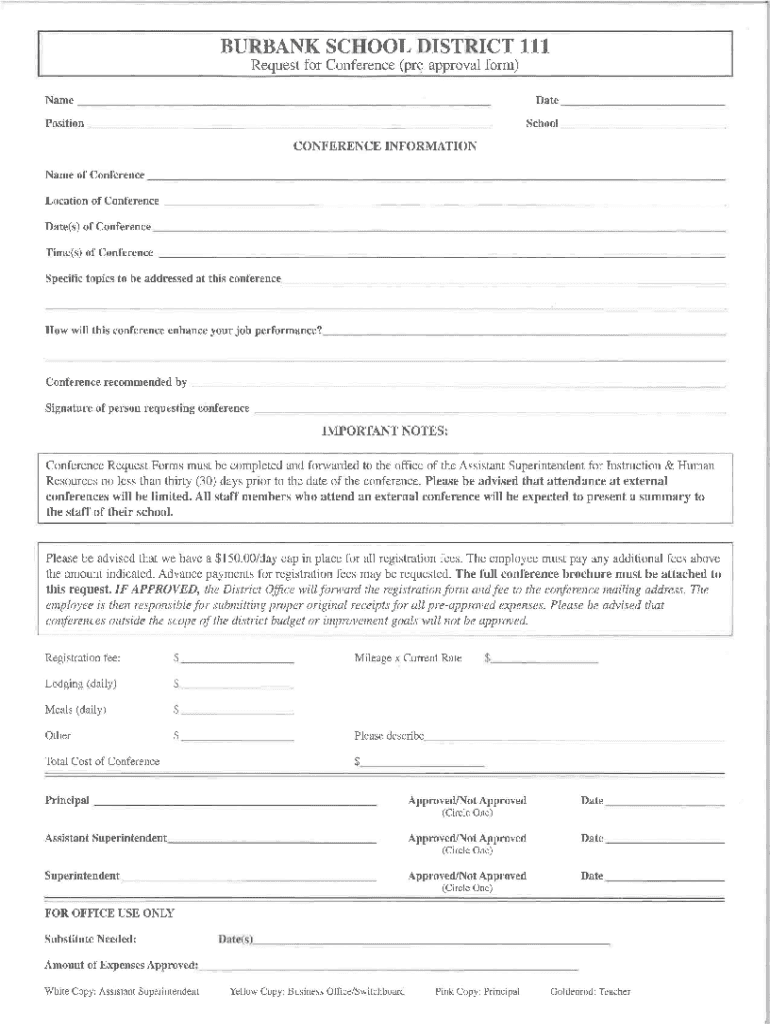 BURBANK SCHOOL DISTRICT 111 Request for Conference (preapproval form) Name Date Position School CONFERENCE INFORMATION NameofConfurence Location of Conference Date(s) of Conference Time(s) of Conference