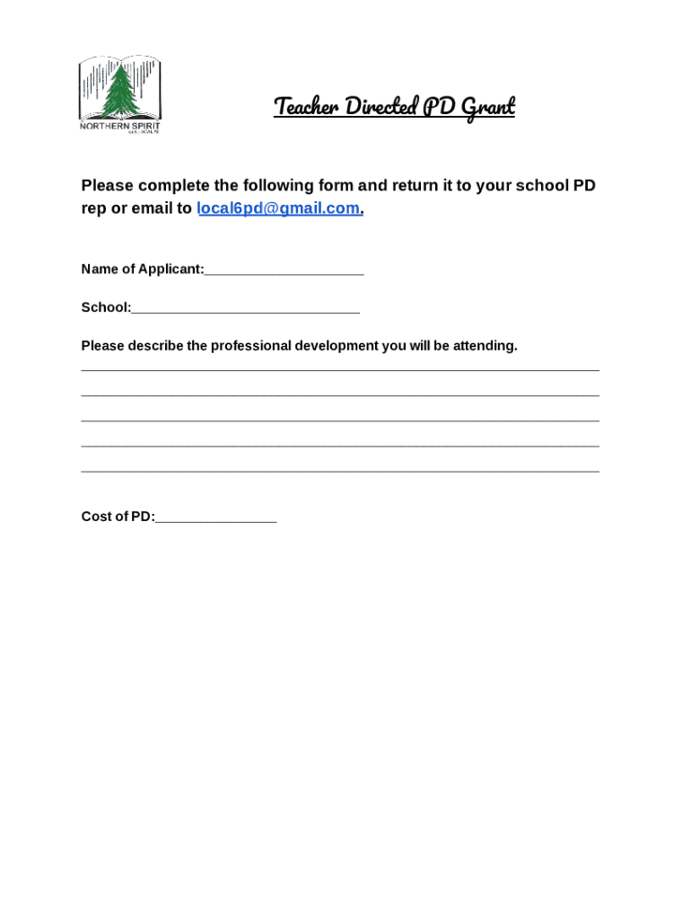 Teacher Direct PD Gran Please complete the following form and return it to your school PD rep or email to local6pd gmail.com. Name of Applicant: School: Please describe the professional development