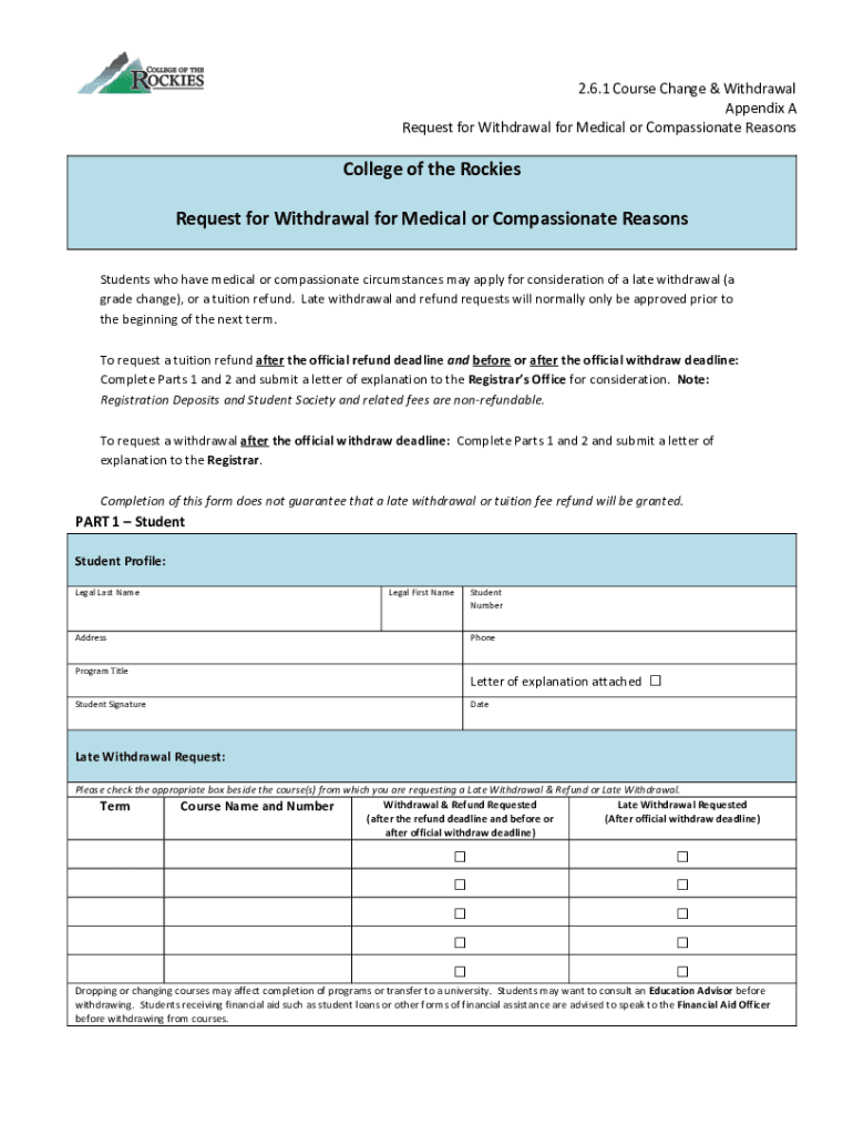 2.6.1 Course Change & Withdrawal Appendix A Request for Withdrawal for Medical or Compassionate ReasonsCollege of the Rockies Request for Withdrawal for Medical or Compassionate Reasons Students who