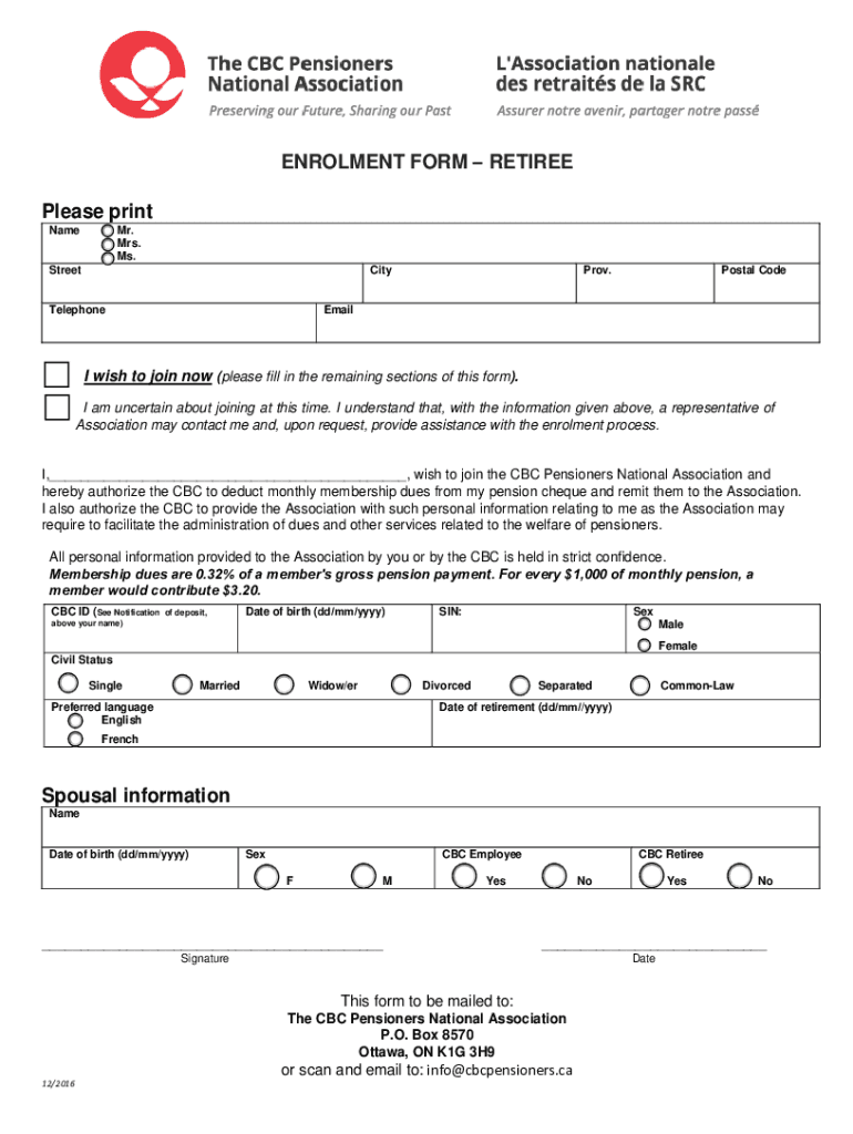 Enrollment FORM RETIREE Please print Name Mr. Mrs. Ms. StreetCityTelephoneProv. Postal CodeEmailI wish to join now (please fill in the remaining sections of this form). I am uncertain about joining