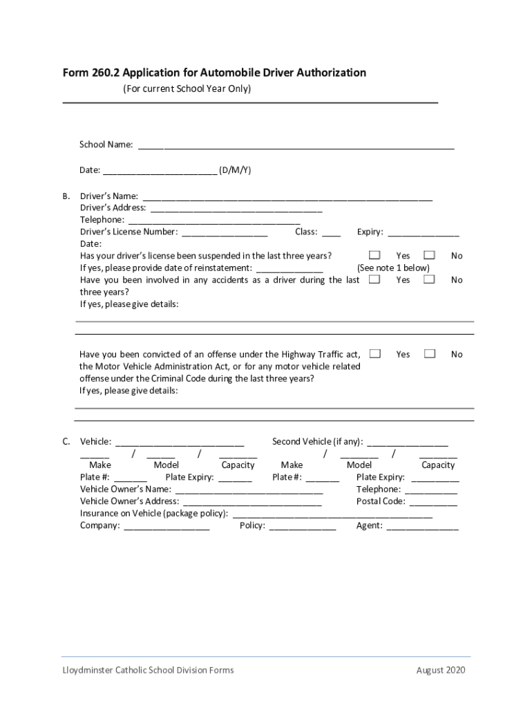 Form 260.2 Application for Automobile Driver Authorization (For current School Year Only)1. School Name: Date: (D/M/Y) B. Drivers Name: Drivers Address: Telephone: Driver's License Number: Class:
