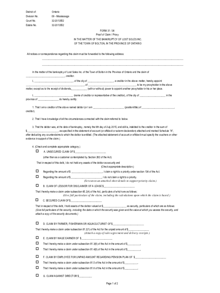District of:OntarioDivision No.09 MississaugaCourt No.322013552Estate No.322013552 FORM 31 / 36 Proof of Claim / Proxy IN THE MATTER OF THE BANKRUPTCY OF LOST SOLES INC. OF THE TOWN OF BOLTON, IN