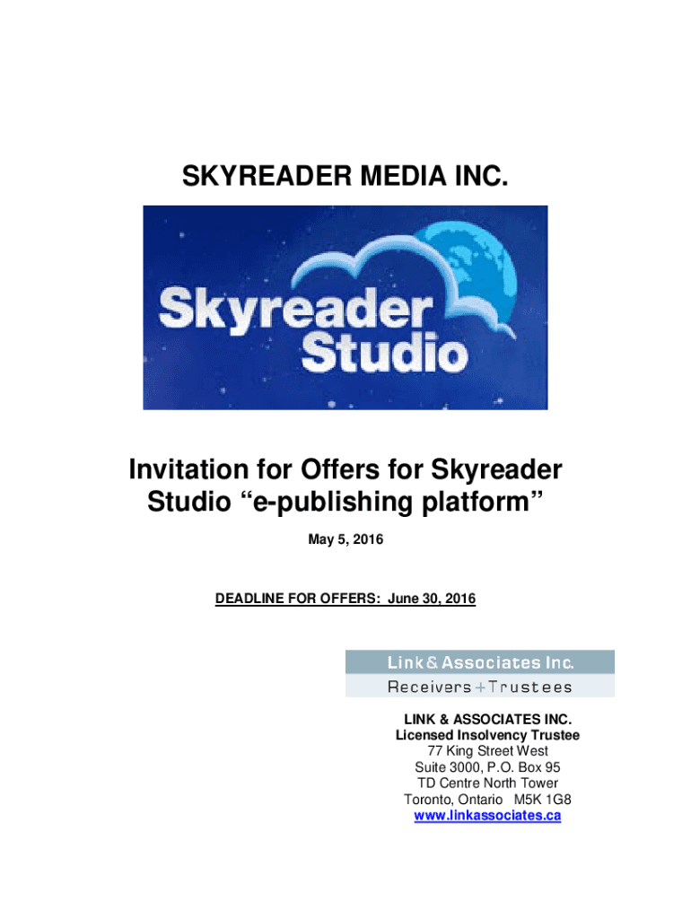 SPREADER MEDIA INC. Invitation for Offers for Sky reader Studio publishing platform May 5, 2016DEADLINE FOR OFFERS: June 30, 2016LINK & ASSOCIATES INC. Licensed Insolvency Trustee 77 King Street West
