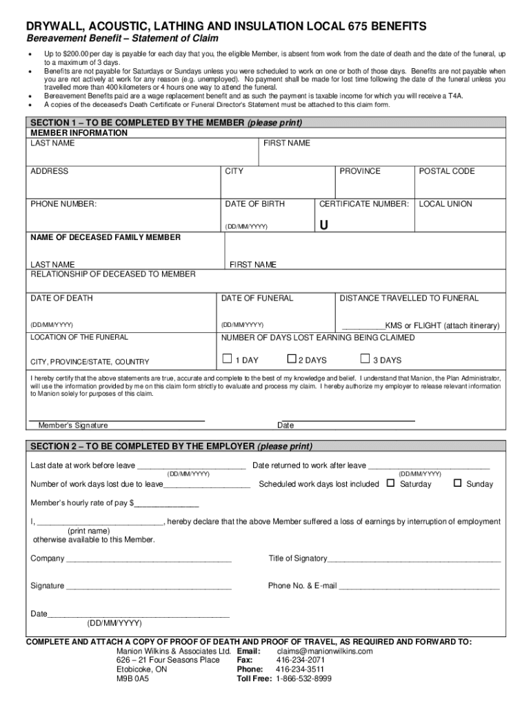 DRYWALL, ACOUSTIC, LATHING AND INSULATION LOCAL 675 BENEFITS Bereavement Benefit Statement of Claim Up to $200.00 per day is payable for each day that you, the eligible Member, is absent from work