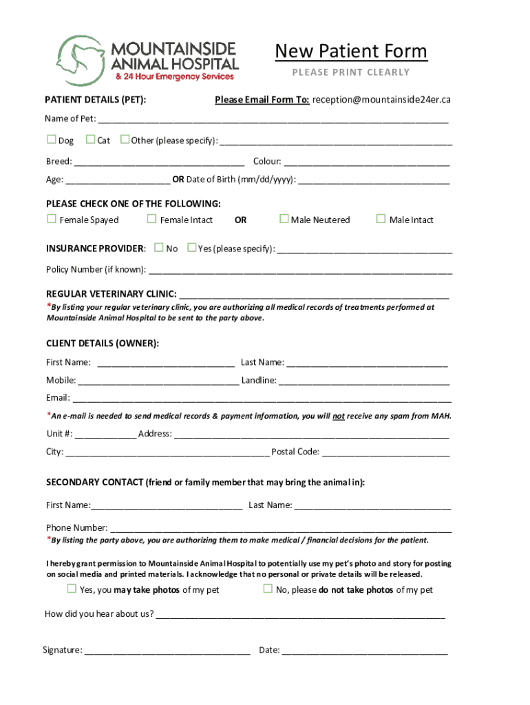 New Patient Form PLEASE PRINT CLEAR Y PATIENT DETAILS (PET):Please Email Form To: reception mountainside24er. Canapé of Pet: Dog Cat Other (please specify): Breed: Color: Age: OR Date of Birth (mm/dd/YYY):