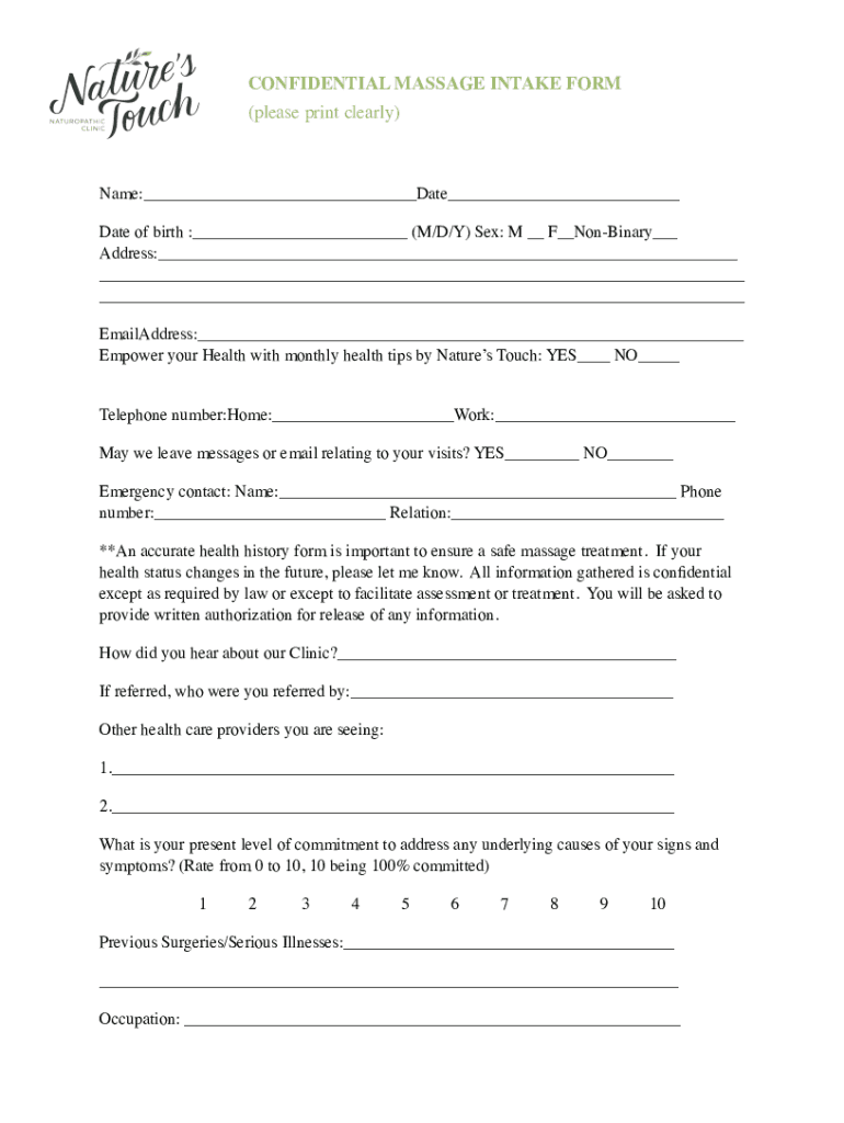 CONFIDENTIAL MASSAGE INTAKE FORM (please print clearly)Name: Date of birth : (M/D/Y) Sex: M F NonBinary Address: Misaddress: Empower your Health with monthly health tips by Natures Touch: YES NO Telephone