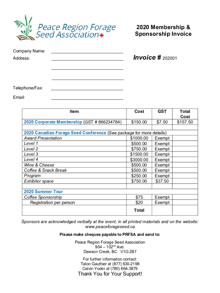 2020 Membership & Sponsorship Invoice Company Name: Address: Invoice # 202001 Telephone/Fax: Email: Item2020 Corporate Membership (GST # 866234784)CostGST$$150.007.50Total Cost $157.502020 Canadian