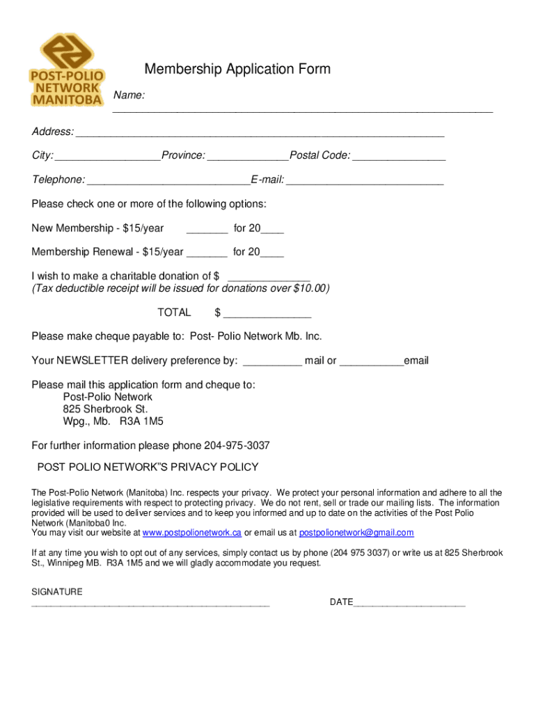 Membership Application Form Name: Address: City: Province: Postal Code: Telephone: Email: Please check one or more of the following options: New Membership $15/year for 20 Membership Renewal $15/year
