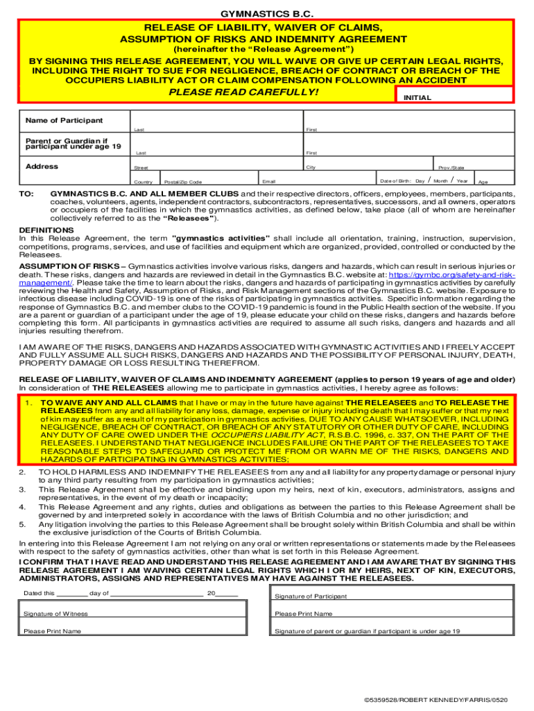 GYMNASTICS B.C.RELEASE OF LIABILITY, WAIVER OF CLAIMS,