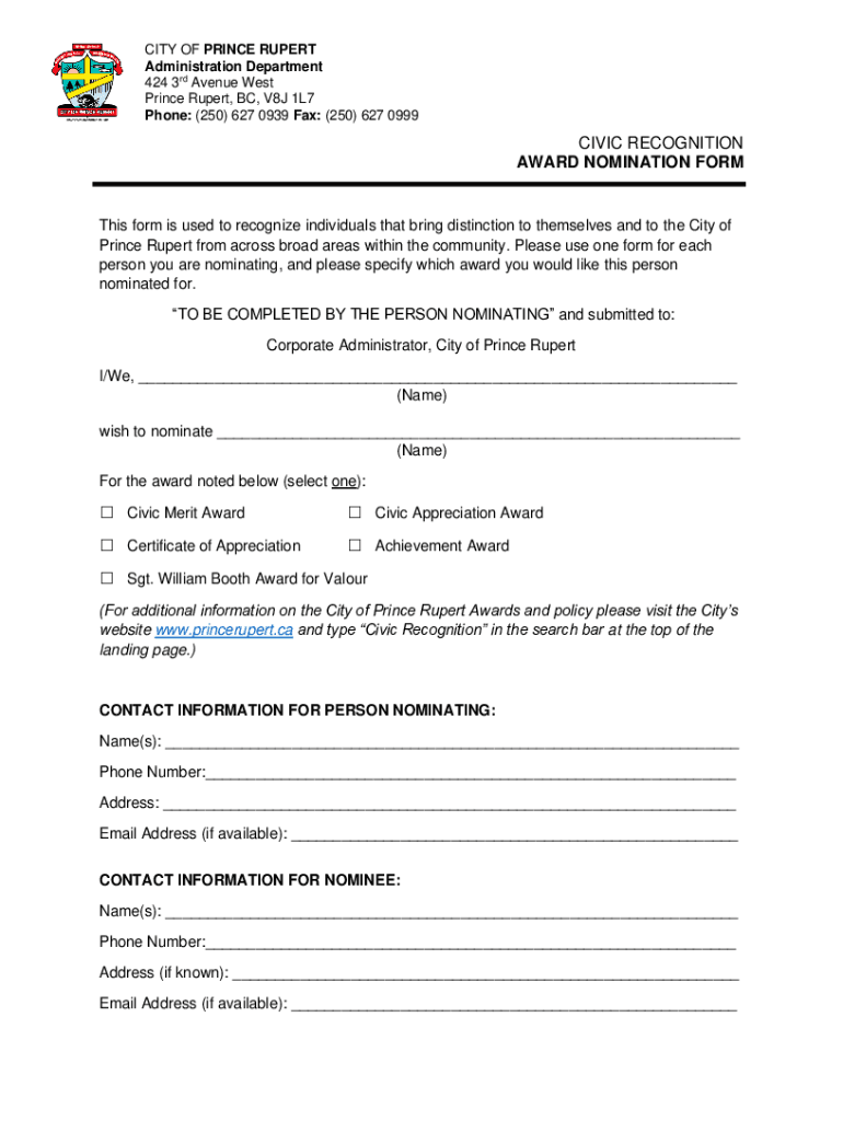 Phone: (250) 627 0939 Fax: (250) 627 0999CIVIC RECOGNITION