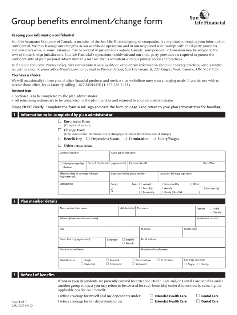 Get the free Group benefits enrolment/change form - Sun Life FinancialGroup benefits enrolment fo...