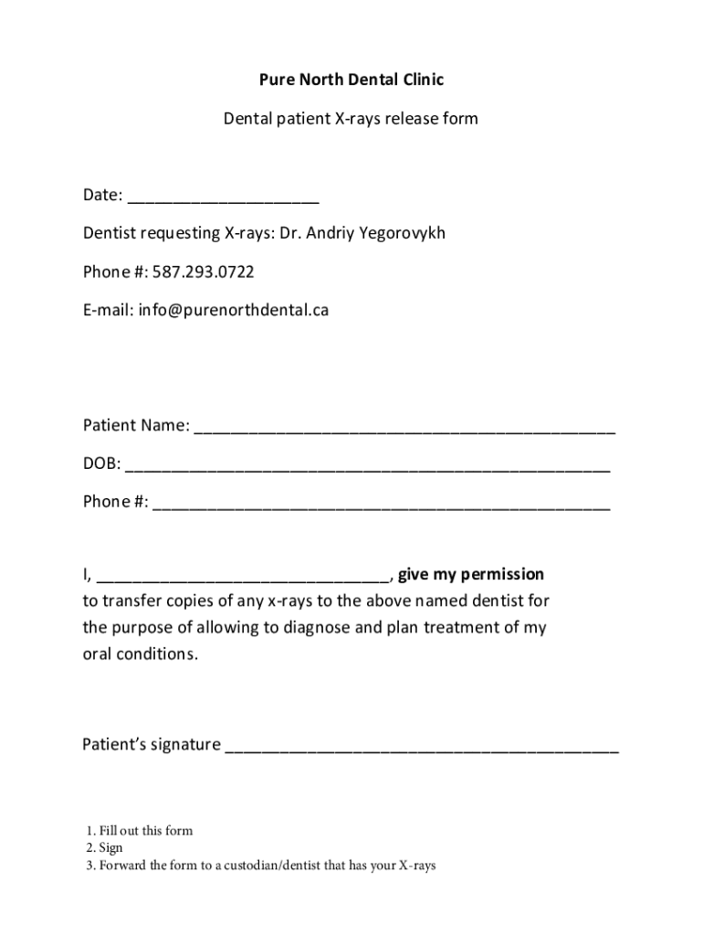 PureNorthDentalClinic DentalpatientXraysreleaseformDate: DentistrequestingXrays:Dr. AndriyYegorovykh Phone#:587.293.0722 Email:info purenorthdental.caPatientName: DOB: Phone#: I, givemypermission