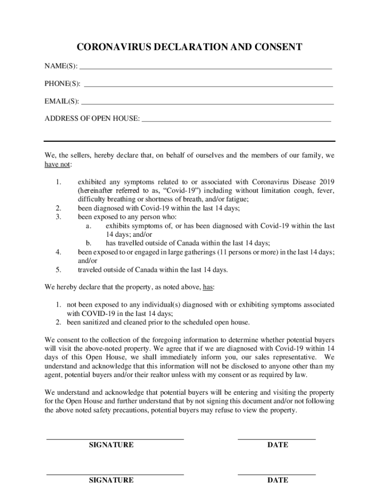 CORONAVIRUS DECLARATION AND CONSENT NAME(S): PHONE(S): EMAIL(S): ADDRESS OF OPEN HOUSE: We, the sellers, hereby declare that, on behalf of ourselves and the members of our family, we have not: 1.2.