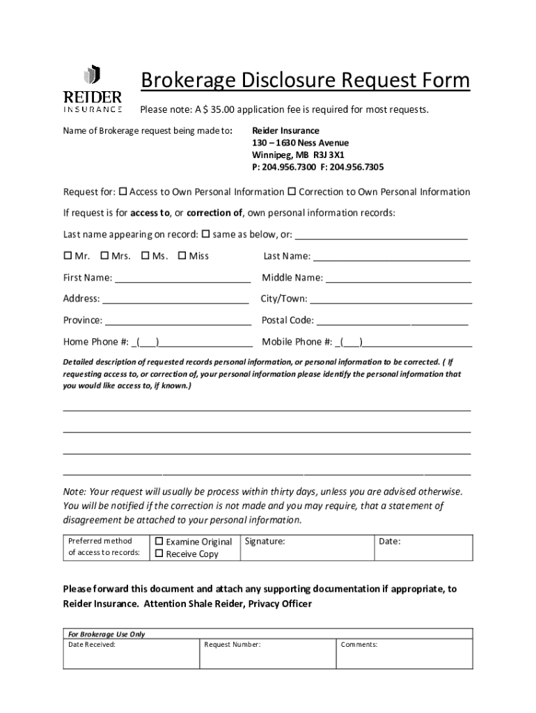 Brokerage Disclosure Request Form Please note: A $35.00 application fee is required for most requests. Name of Brokerage request being made to:Radar Insurance 130 1630 Less Avenue Winnipeg, MB R3J