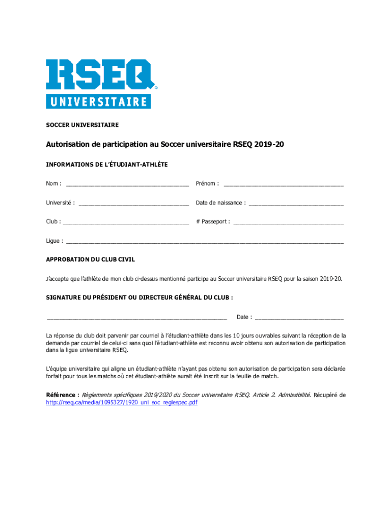 SOCCER UNIVERSITAIREAutorisation de participation Au Soccer universities SEQ 201920 Information DE LTUDIANTATHLTE Not : Prom : University : Date de Renaissance : Club : # Passport : Life : APPROBATION