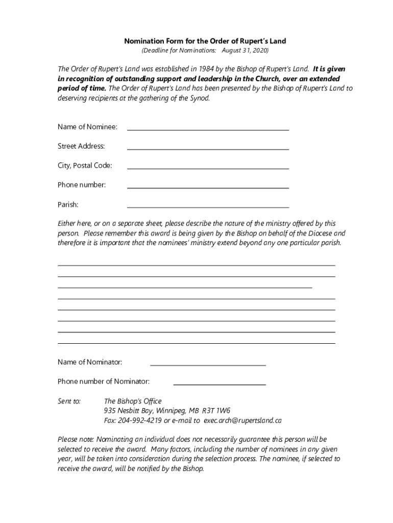 (Deadline for Nominations: August 31, 2020)The Order of Rupert's Land was established in 1984 by the Bishop of Rupert's Land. It is given
