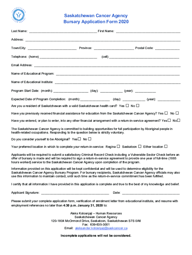 Saskatchewan Cancer Agency Bursary Application Form 2020 Last Name: First Name: Address: Town/City: Province: Postal Code: Telephone: (home) (cell) Email Address: Name of Educational Program: Name