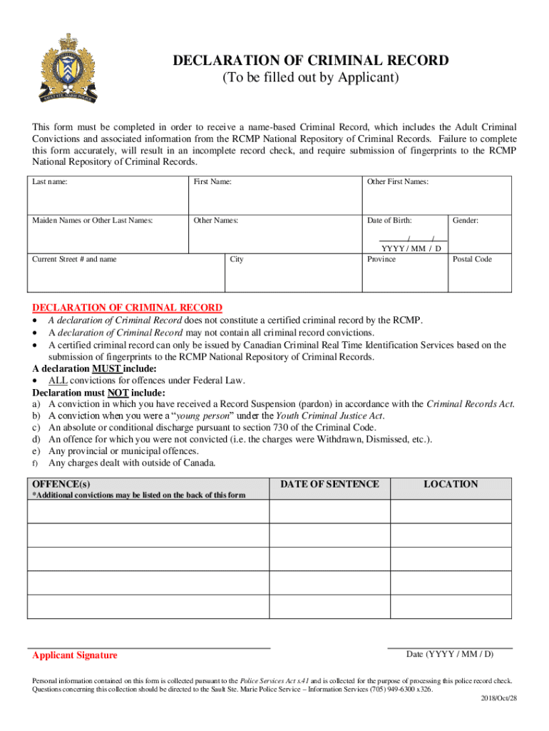 Get the free DECLARATION OF CRIMINAL RECORD - Brockville Police Service