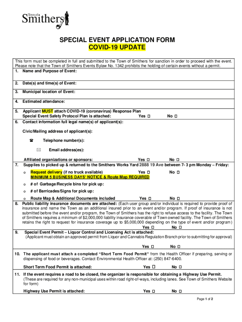 This form must be completed in full and submitted to the Town of Smothers for sanction in order to proceed with the event.