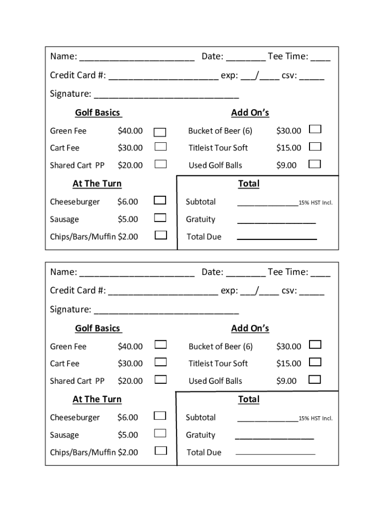 Name: Date: Tee Time: Credit Card #: exp: / CSV: Signature: Golf Basics Onscreen Fee$40.00Bucket of Beer (6)$30.00Cart Fee$30.00Titleist Tour Soft$15.00Shared Cart PP$20.00Used Golf Balls$9.00At The
