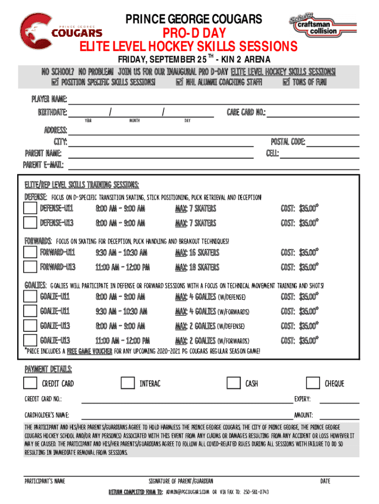 PRINCE GEORGE COUGARSPROD DAY ELITE LEVEL HOCKEY SKILLS SESSIONS FRIDAY, SEPTEMBER 25TH KIN 2 ARENA No school? No problem! Join us for our Inaugural Pro Day ELITE LEVEL HOCKEY SKILLS SESSIONS! POSITION