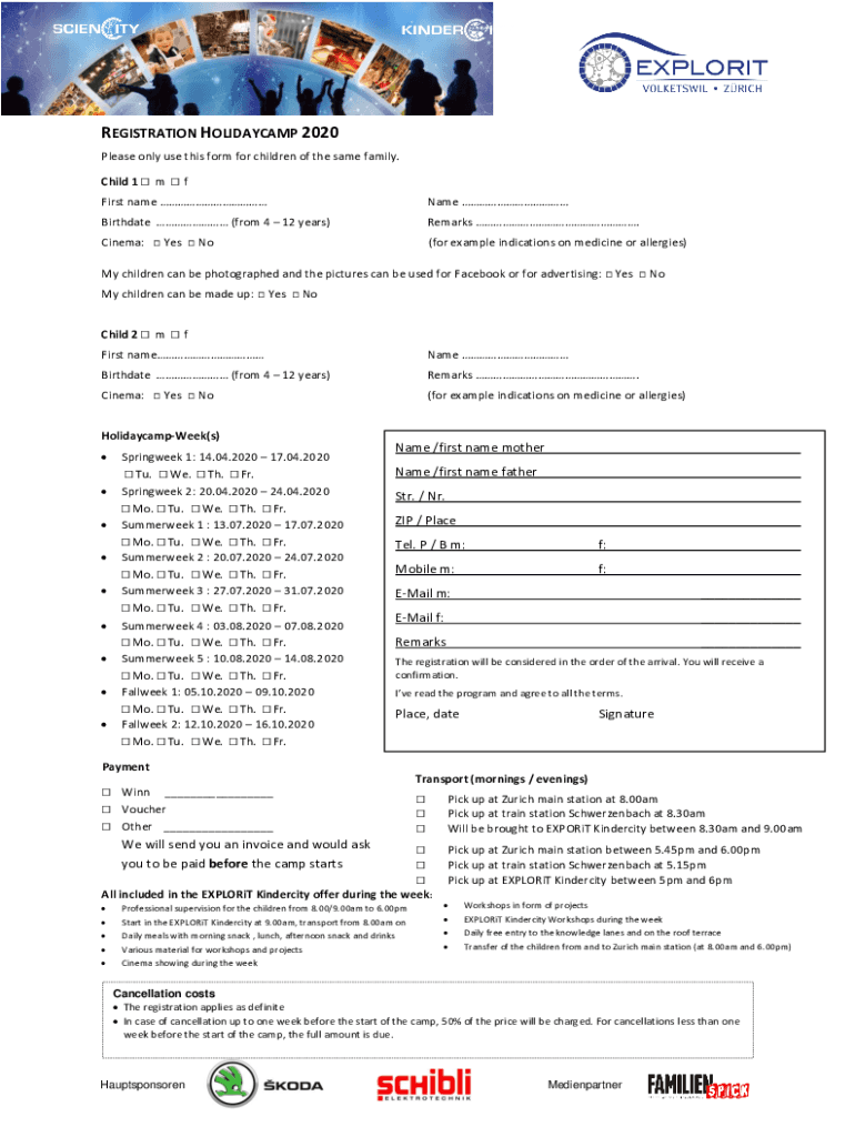 REGISTRATION HOLIDAYCAMP 2020 Please only use this form for children of the same family. Child 1 m f First name Birthdate (from 4 12 years)Remarks. Cinema: Yes No(for example indications on medicine