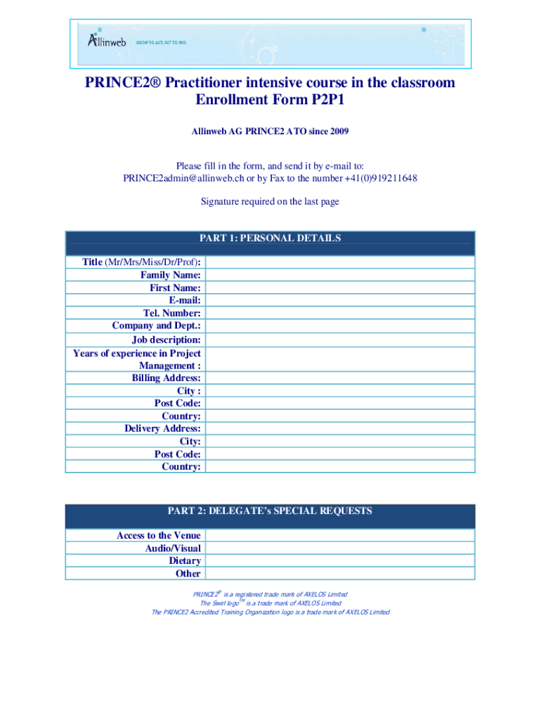 Individuals intending to enroll in the PRINCE2-001P course need to fill out form PRINCE2-001P Enrollment.
