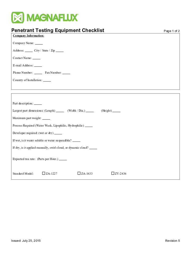 Penetrant Testing Equipment Checklist Page 1 of 2Company Information: Company Name: Address: City / State / Zip Contact Name: Email Address: Phone Number: Fax Number: Country of Installation: Part