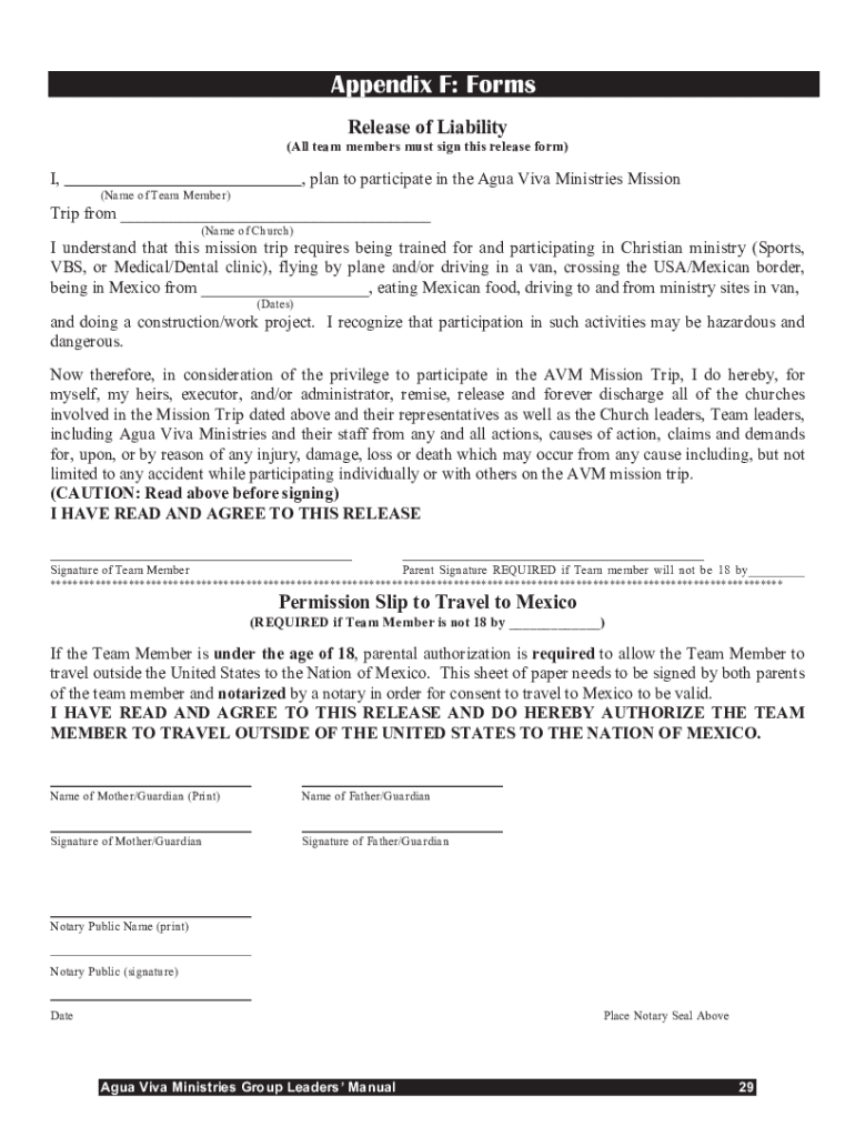 Appendix F: Forms Release of Liability (All team members must sign this release form)I, plan to participate in the Agra Viva Ministries Mission (Name of Team Member)Trip from (Name of Church)I understand