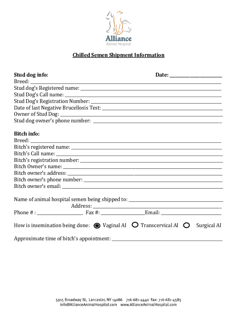 Chilled Semen Shipment InformationStud dog info: Date: Breed: Stud dogs Registered name: Stud Dogs Call name: Stud Dogs Registration Number: Date of last Negative Brucellosis Test: Owner of Stud Dog: