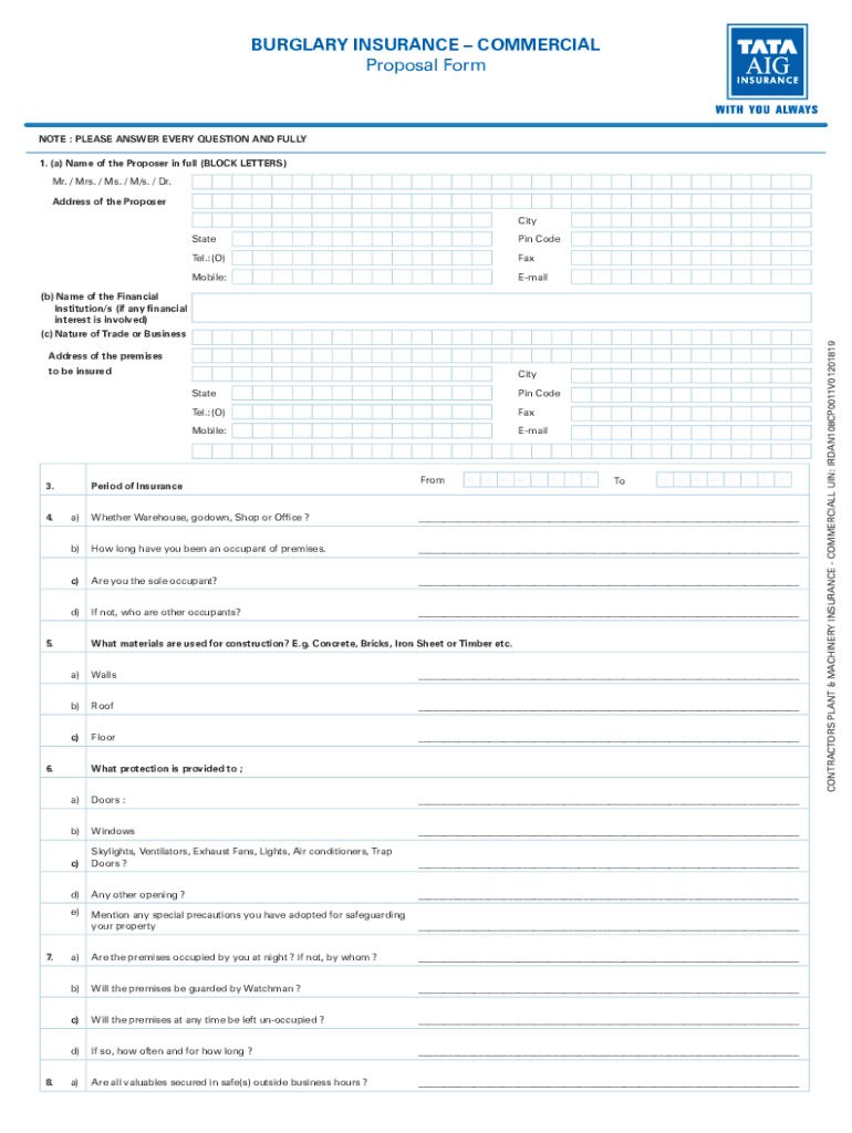 BURGLARY INSURANCE COMMERCIAL Proposal Footnote : PLEASE ANSWER EVERY QUESTION AND FULLY 1. (a) Name of the Proposer in full (BLOCK LETTERS) Mr. / Mrs. / Ms. / M/s. / Dr. Address of the Proposer City