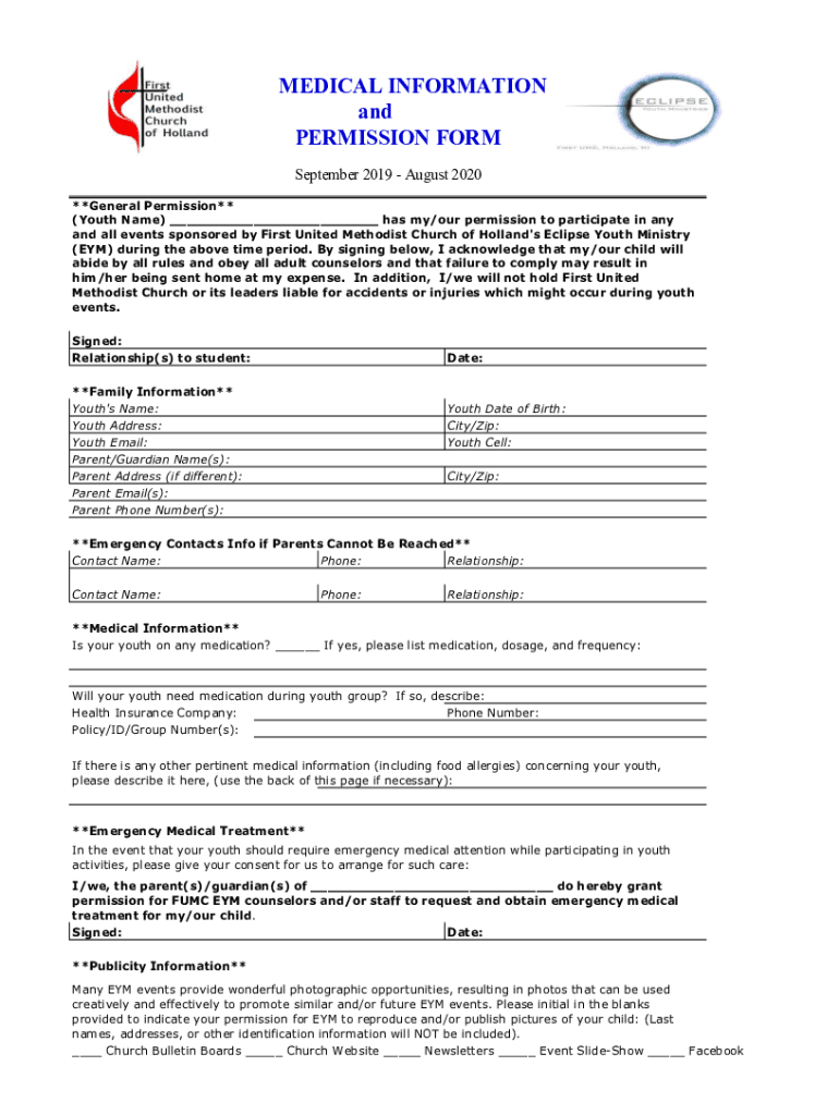 MEDICAL INFORMATION and PERMISSION FORM September 2019 August 2020 **General Permission** (Youth Name) has my/our permission to participate in any and all events sponsored by First United Methodist
