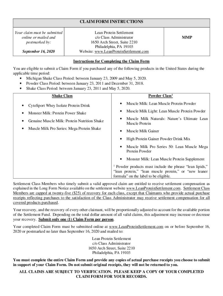 CLAIM FORM INSTRUCTIONS Your claim must be submitted online or mailed and postmarked by: September 16, 2020Lean Protein Settlement c/o Class Administrator 1650 Arch Street, Suite 2210 Philadelphia,