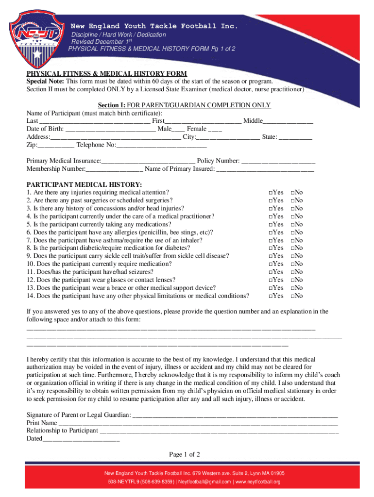 New England Youth Tackle Football Inc. Discipline / Hard Work / Dedication Revised December 1st PHYSICAL FITNESS & MEDICAL HISTORY FORM Pg 1 of 2PHYSICAL FITNESS & MEDICAL HISTORY FORM Special Note: