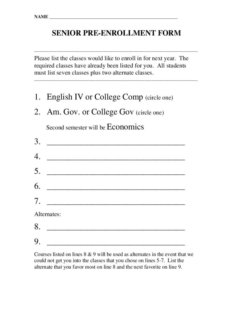 NAME SENIOR ENROLLMENT FORM Please list the classes would like to enroll in for next year. The required classes have already been listed for you. All students must list seven classes plus two alternate