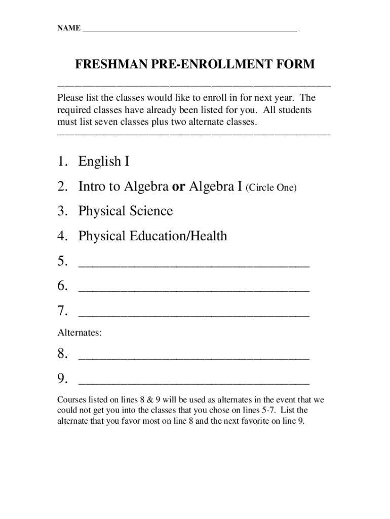 NAME FRESHMAN ENROLLMENT FORM Please list the classes would like to enroll in for next year. The required classes have already been listed for you. All students must list seven classes plus two alternate