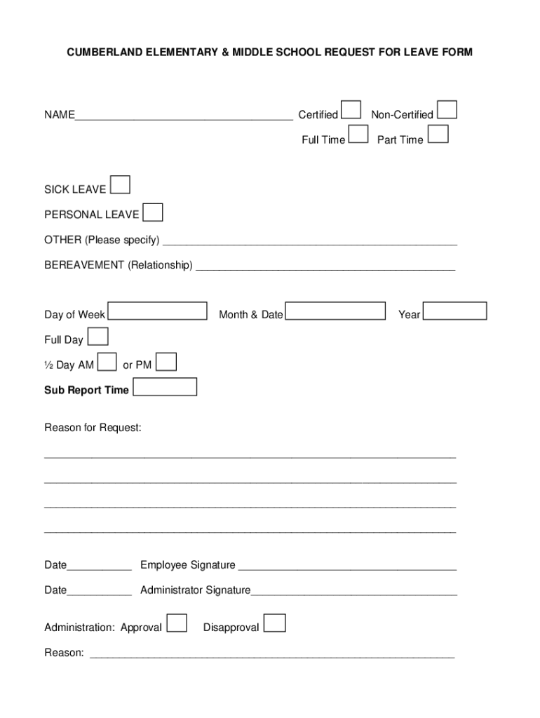 CUMBERLAND ELEMENTARY & MIDDLE SCHOOL REQUEST FOR LEAVE FORENAME Certified Full TimeNonCertified Part Homesick LEAVE PERSONAL LEAVE OTHER (Please specify) BEREAVEMENT (Relationship) Day of Weeklong