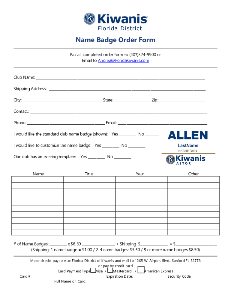 Name Badge Order Form Fax all completed order form to (407)3249900 or Email to Andrea ForidaKiwanis.com Club Name: Shipping Address: City: State: Zip: Contact: Phone: Email: I would like the standard