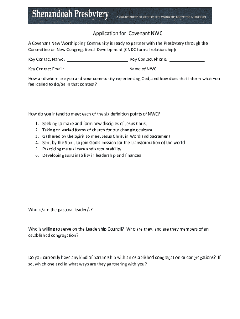 ApplicationforCovenant NWCACovenant NewWorshippingCommunityisreadytopartnerwiththe Presbytery through the Committee on NewCongregationalDevelopment (CDC formal relationship): KeyContactName: KeyContactPhone: