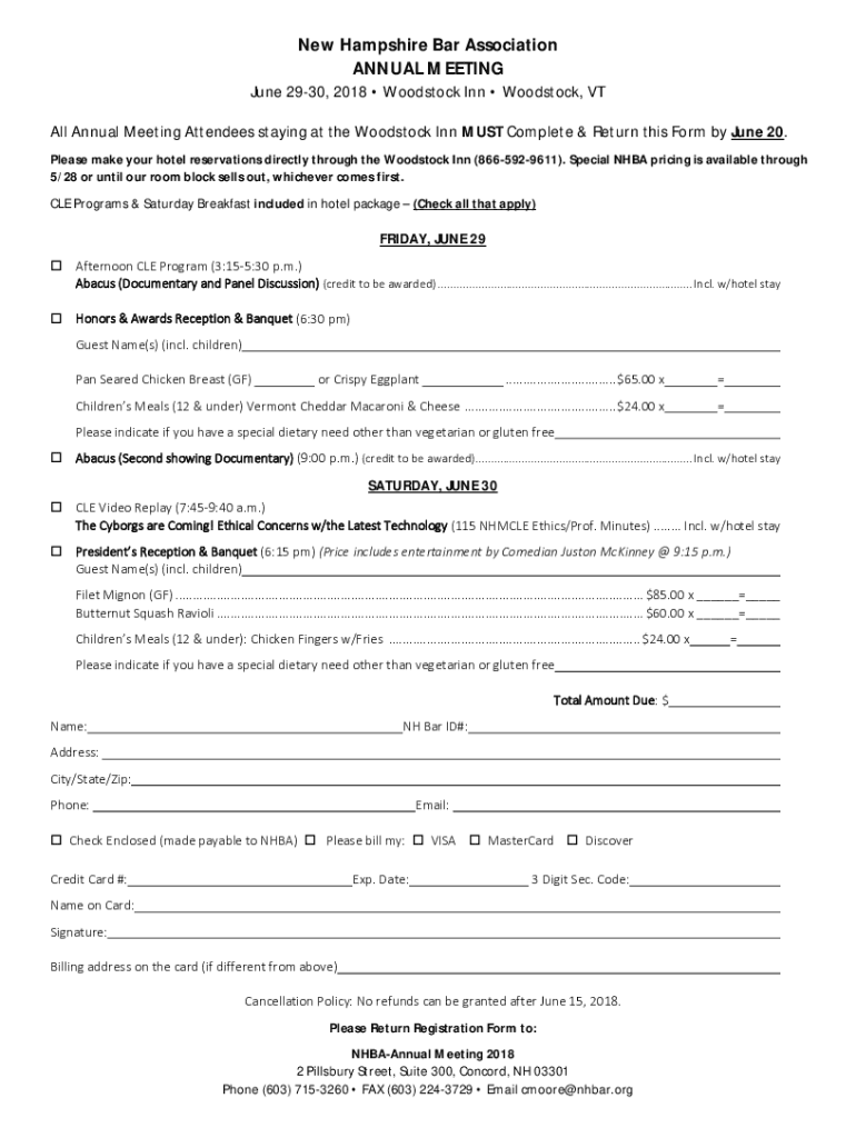 New Hampshire Bar Association ANNUAL MEETING June 2930, 2018 Woodstock Inn Woodstock, VT All Annual Meeting Attendees staying at the Woodstock Inn MUST Complete & Return this Form by June 20. Please