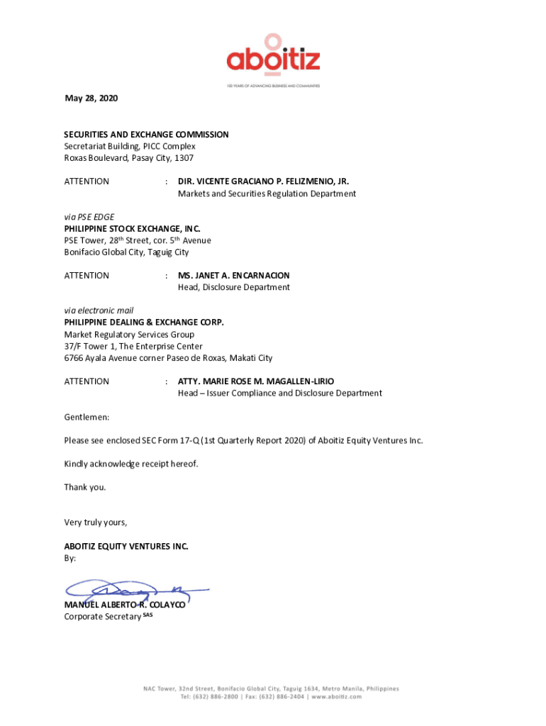 May 28, 2020SECURITIES AND EXCHANGE COMMISSION Secretariat Building, PICC Complex Rojas Boulevard, Pasty City, 1307 ATTENTION:DIR. VICENTE GRACIANO P. FELIZMENIO, JR. Markets and Securities Regulation