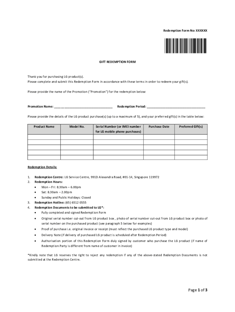 Redemption Form No: XXXXXXGIFT REDEMPTION Firsthand you for purchasing LG product(s). Please complete and submit this Redemption Form in accordance with these terms in order to redeem your gift(s).