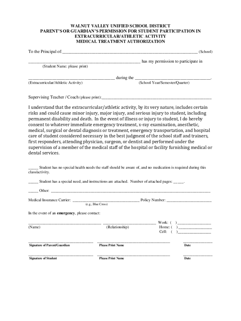 WALNUT VALLEY UNIFIED SCHOOL DISTRICT PARENTS OR GUARDIANS PERMISSION FOR STUDENT PARTICIPATION IN EXTRACURRICULAR/ATHLETIC ACTIVITY MEDICAL TREATMENT AUTHORIZATION To the Principal of: (School) has