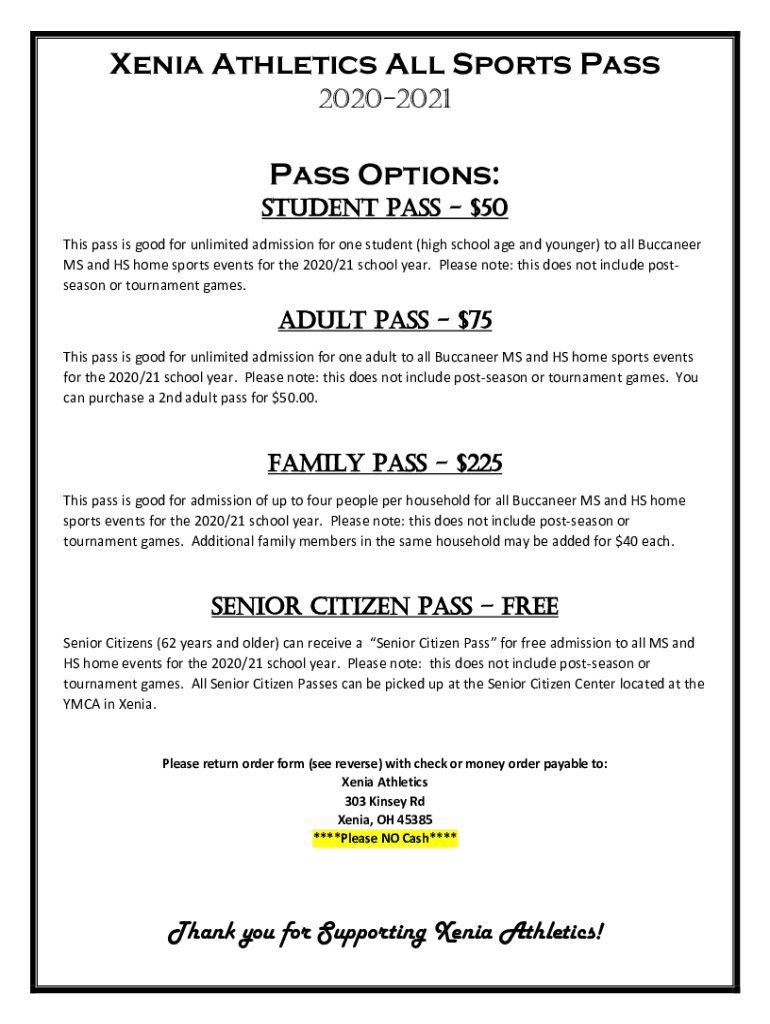 Xenia Athletics All Sports Pass 20202021Pass Options: Student Pass $50 This pass is good for unlimited admission for one student (high school age and younger) to all Buccaneer MS and HS home sports
