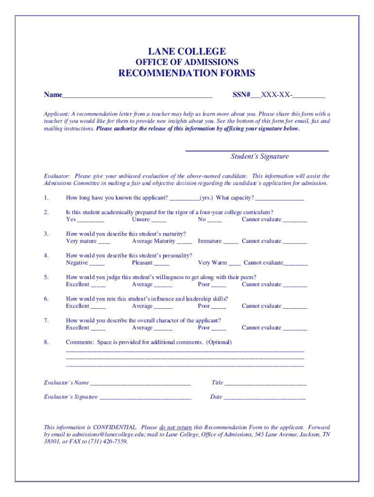 LANE COLLEGE OFFICE OF ADMISSIONSRECOMMENDATION FORMS Name SSN# XXXIX Applicant: A recommendation letter from a teacher may help us learn more about you. Please share this form with a teacher if you