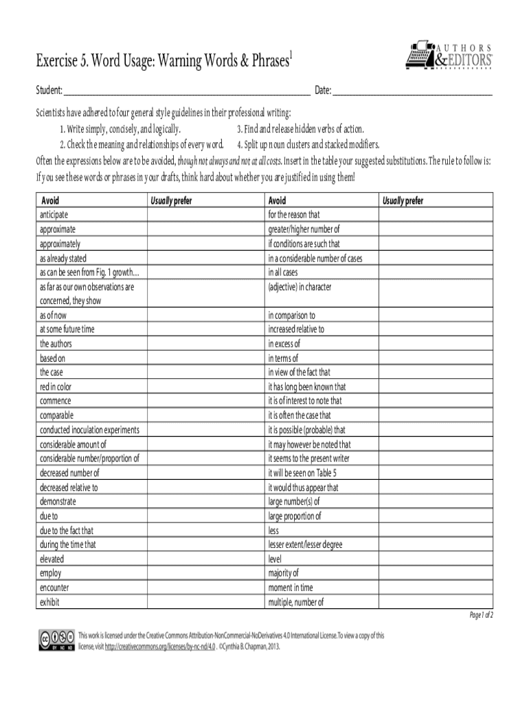 Exercise 5. Word Usage: Warning Words & Phrases1 Student: Date: Scientists have adhered to four general style guidelines in their professional writing: 1. Write simply, concisely, and logically. 3.
