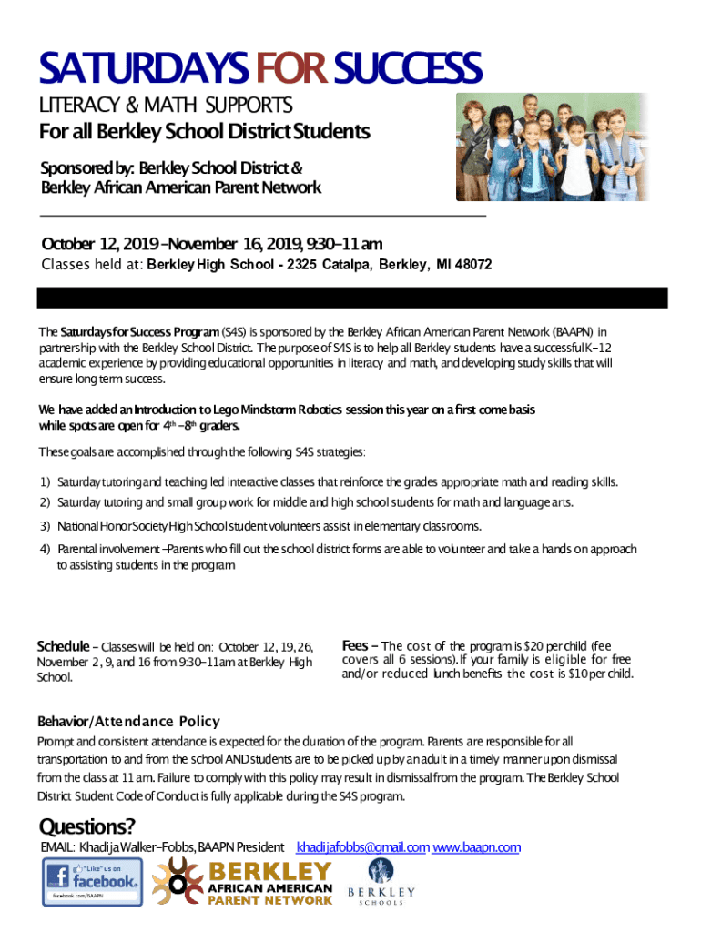 SATURDAYSFORSUCCESS LITERACY & MATH SUPPORTS For all Berkley School DistrictStudents Sponsored by: Berkley School District & Berkley African American Parent Network October 12, 2019November 16, 2019,9:3011am